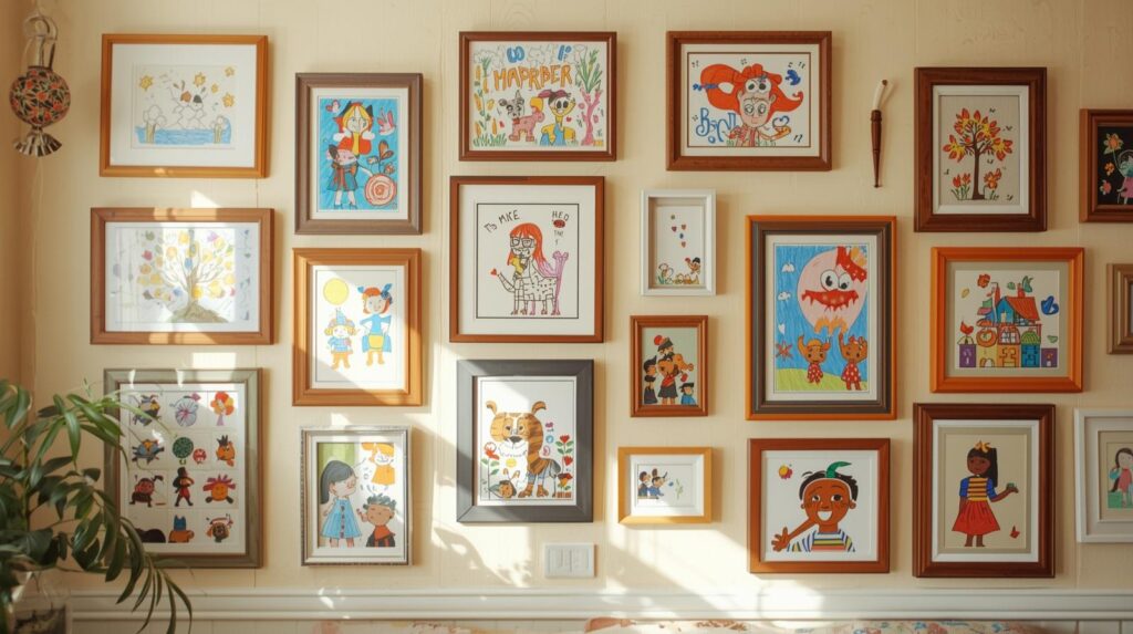 I have come to realize that this way of thinking takes the stress out of decorating. With this perspective, I have created my “imperfect display” of some cherished items that were made by my children when they were young. I hadn’t hung these items for several years because I thought I had to find matching frames and had to find the perfect way to display them. So while I waited for the perfect conditions, these items sadly stayed in the box.